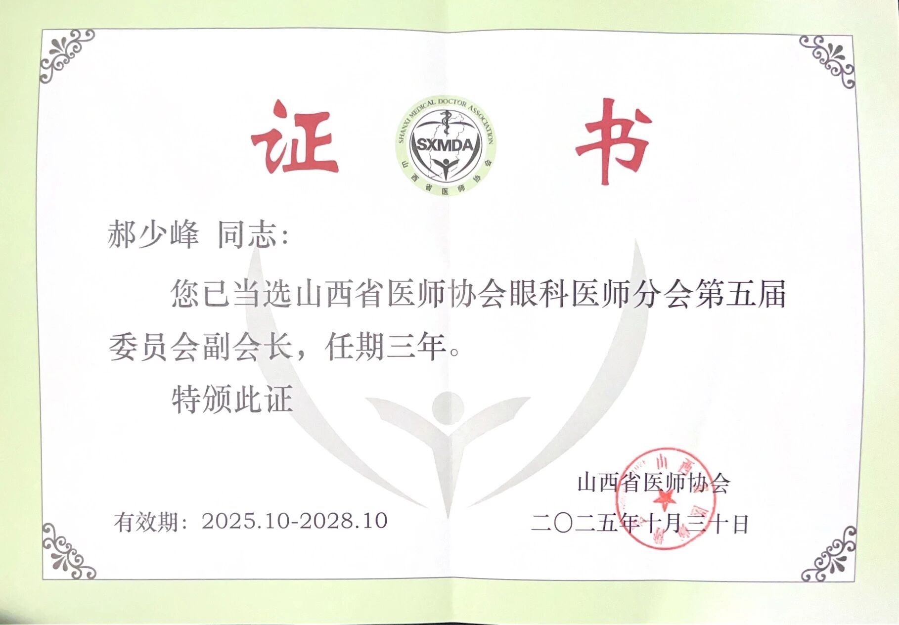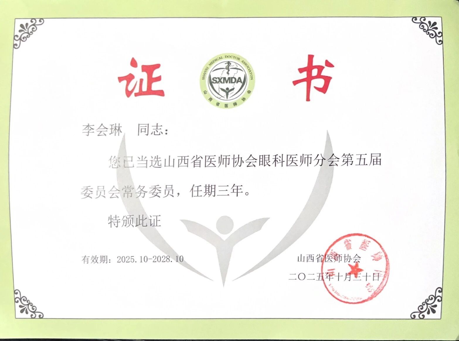 医院党委书记郝少峰当选山西省医师协会眼科医师分会第五届委员会副会长,眼科主任李会琳当选常务委员