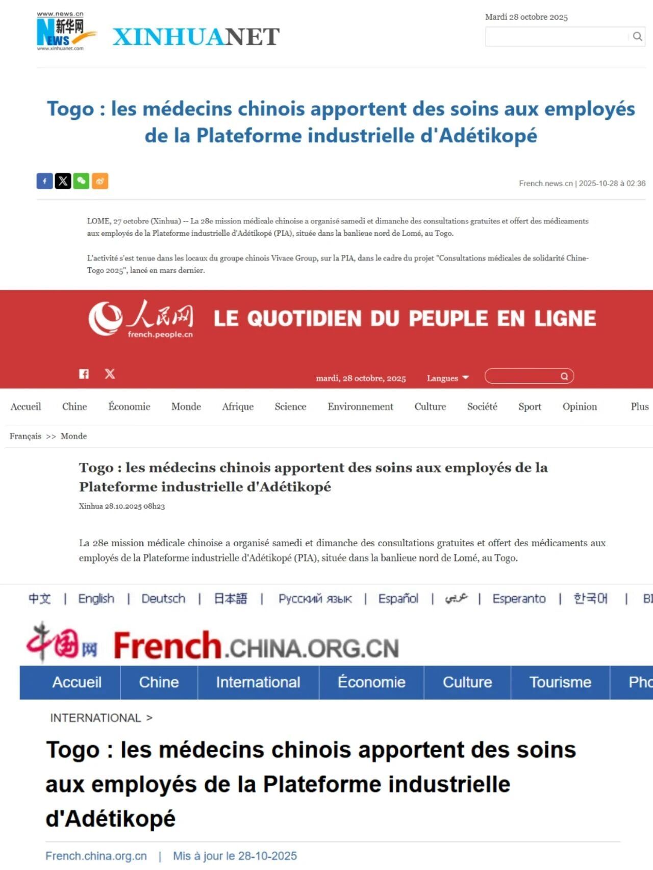 近日,中国(山西)第28批援多哥洛美医疗队在多哥Adétikopé工业园成功举办了大型健康义诊及药品捐赠活动,为500余名园区工人提供了全面的医疗健康服务。此次活动获得了新华网、人民网、中国网等权威媒体的关注与报道,彰显了我院援外医疗工作的扎实成效与国际影响。