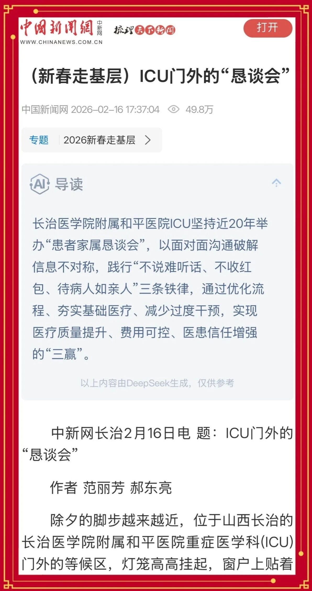 图为中国新闻网报道我院ICU“恳谈会”截图
