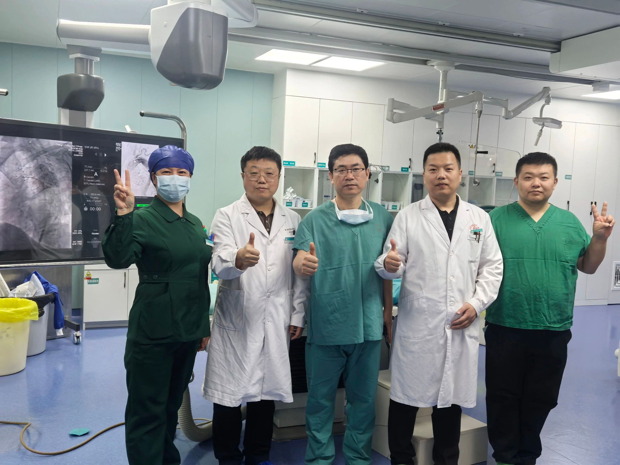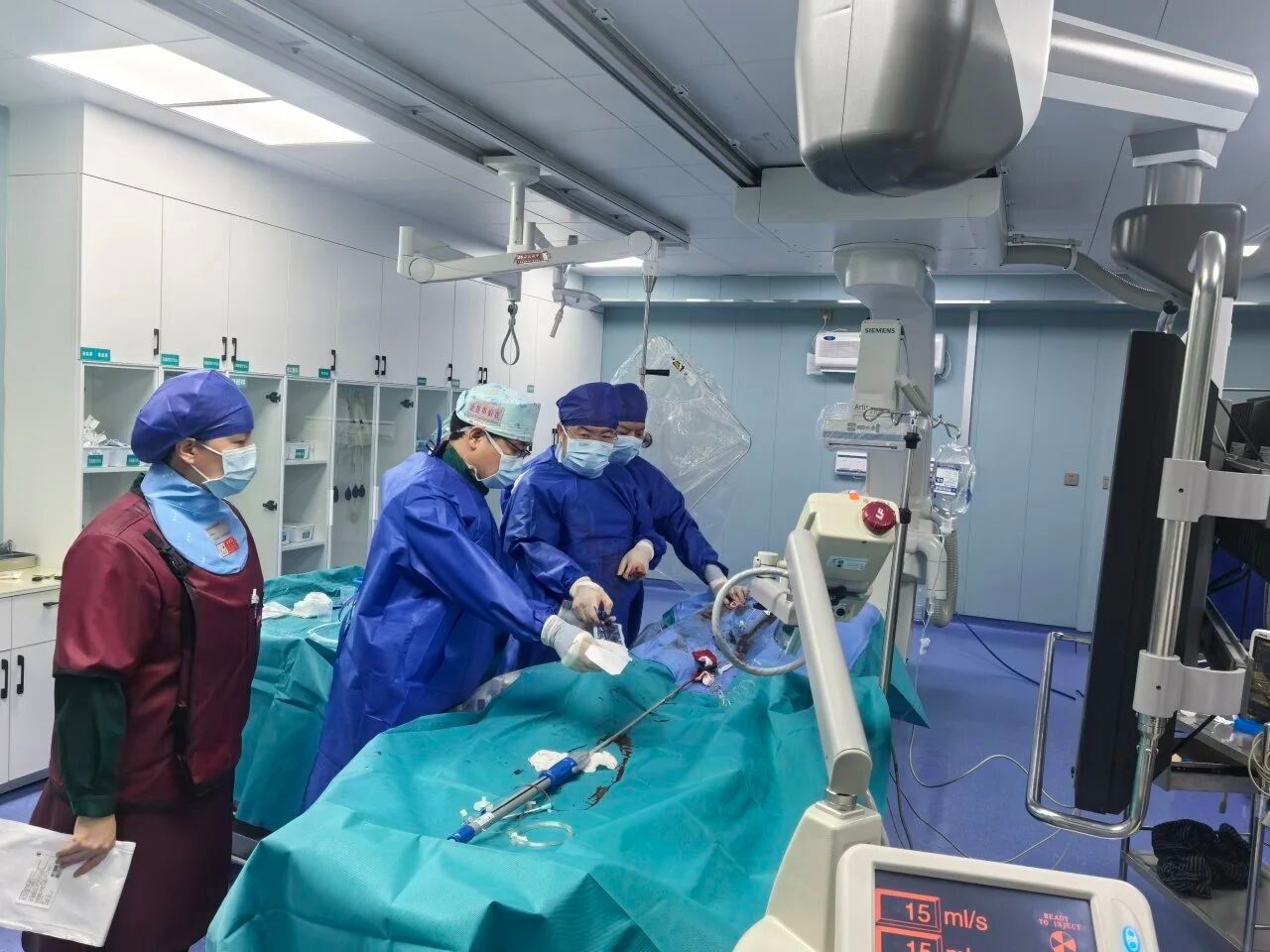 手术当日,在介入导管室的手术间里,气氛紧张而有序。介入治疗团队凭借精湛的技术,通过数字减影血管造影(DSA)的精确引导,麻醉科医师全程严密监护,介入护理团队配合默契,器械传递精准高效,确保患者生命体征平稳。